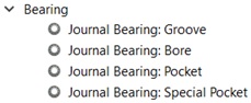 FlowSimulator supports three category of bearings which includes Journal Bearing, Roller bearing & Ball bearing components. Journal bearing has 4 subtypes namely Journal bearing: Bore, Journal bearing: Grove, Journal Bearing: Pocket, Journal bearing: special pocket. All the bearing elements can be used only in Incompressible (e.g. hydraulic and non-hydraulic systems) analysis.