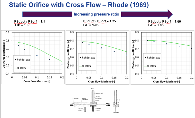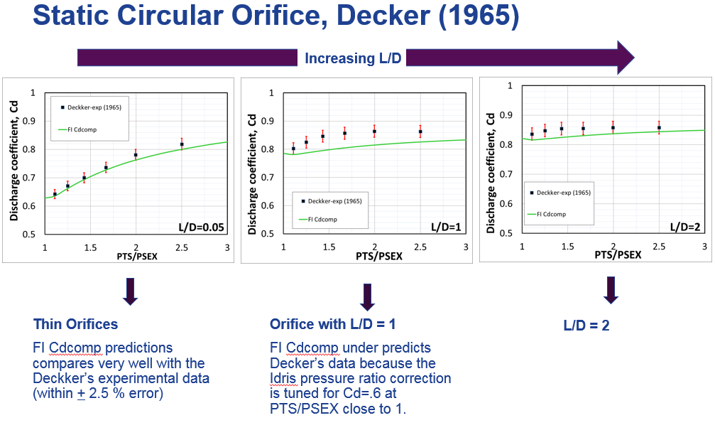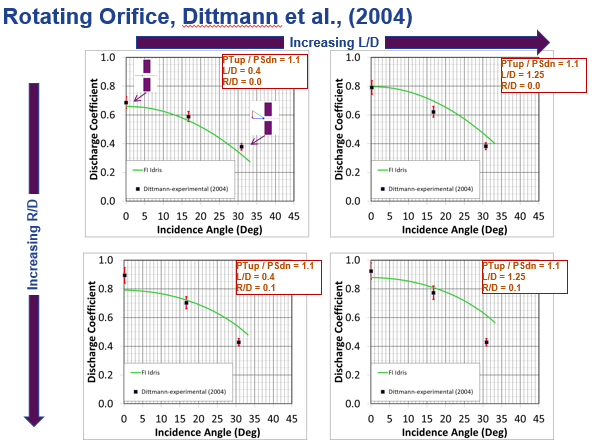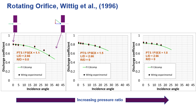 The final effect is not from the Idris paper and is specific to Flow Simulator. The empirical based Cd equations and Flow Simulator may use different upstream pressures (Ptup, aka PTS) in the flow function calculation. The test typically used a total pressure based on the relative velocity but Flow Simulator typically uses a pressure less than this total pressure. The pressure that Flow Simulator uses is based on the upstream chamber velocity vector that is aligned with the centerline of the hole, and the entrance loss setting (Portion of Ustrm Cham. Dyn. Head Lost).