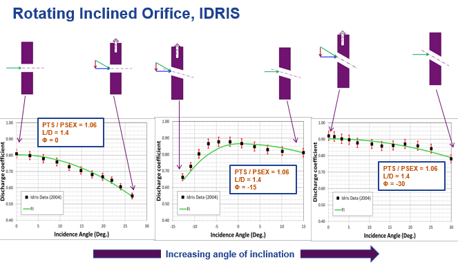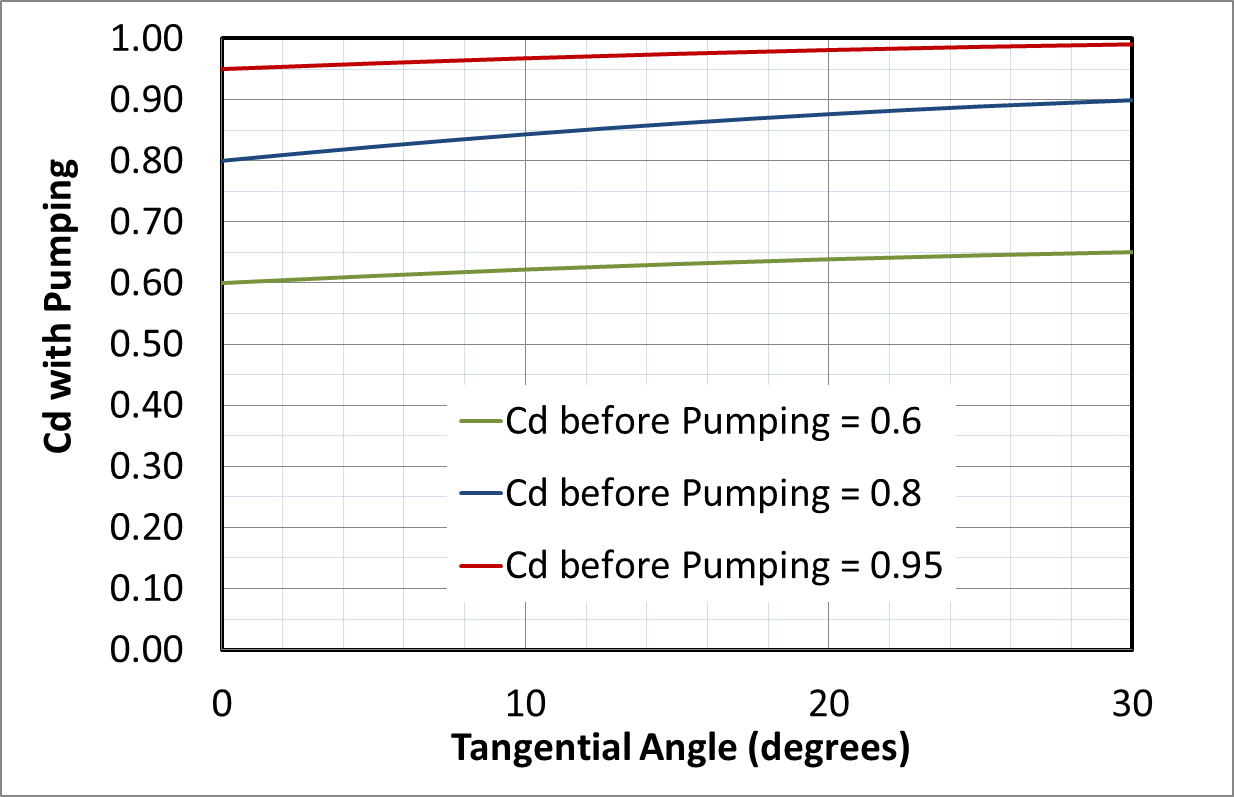 Idris (ref 1) describes a pumping effect that accounts for the fact that the Cd for Incidence angle = 0o is higher for a rotating hole (which must be angled to achieve zero incidence) that it is for a stationary hole. The physics behind this are not clear. The effect is included to match the Idris data, ref. 1.