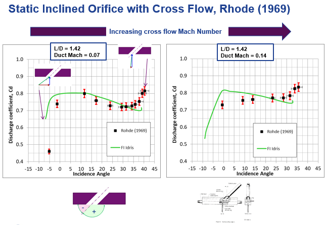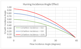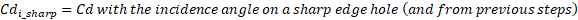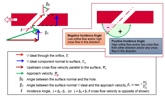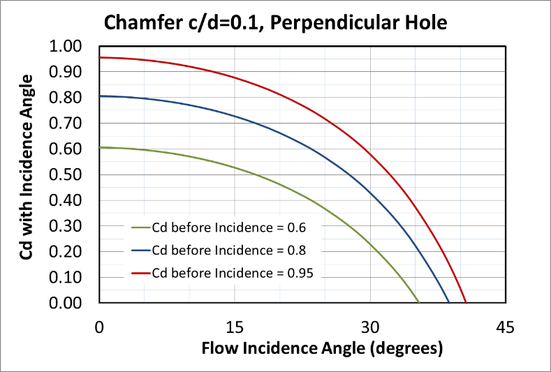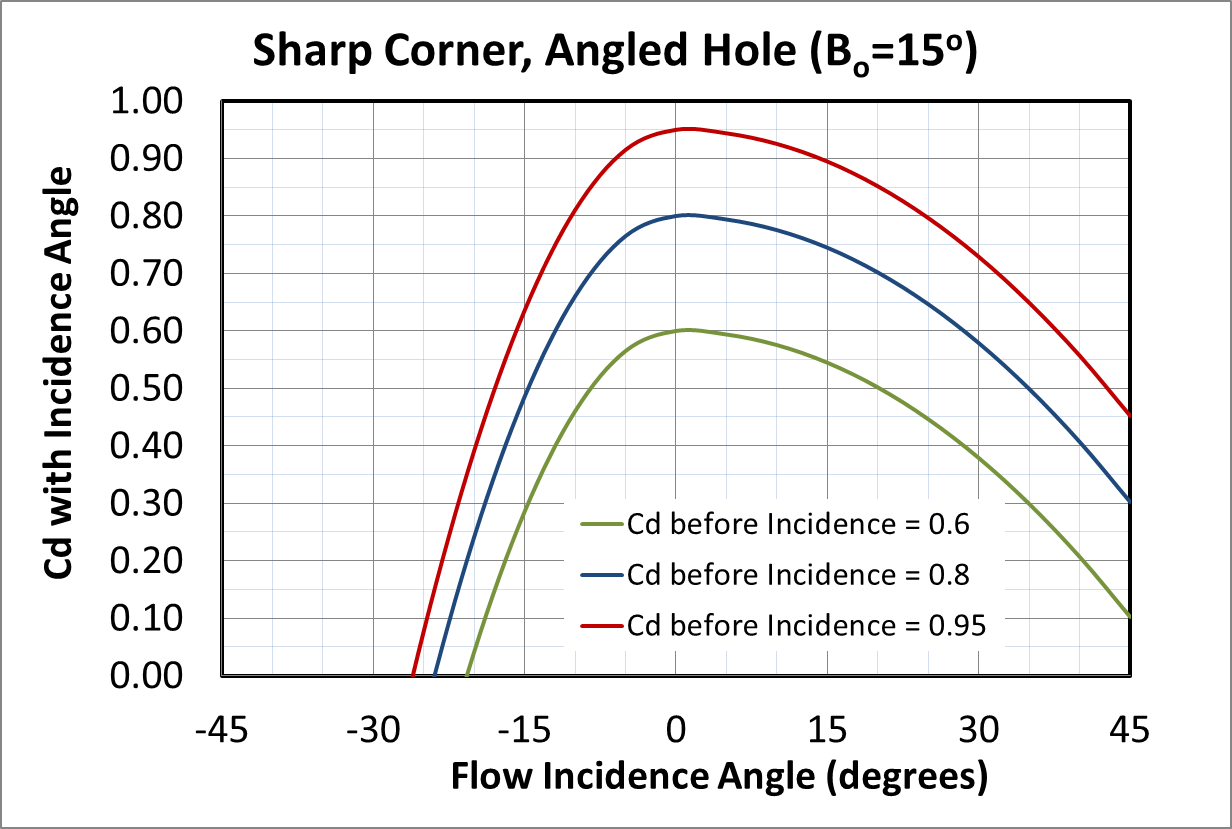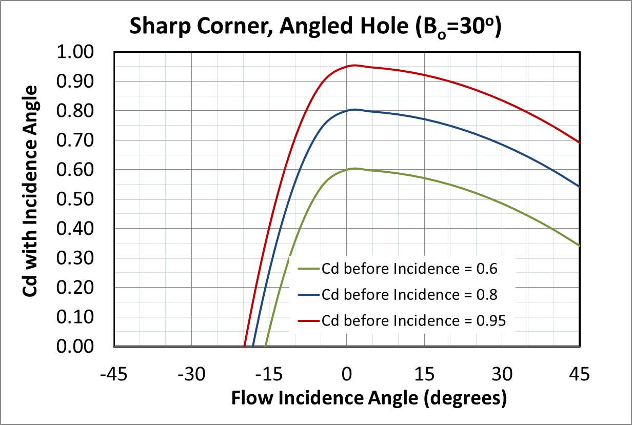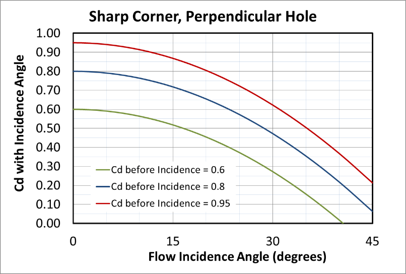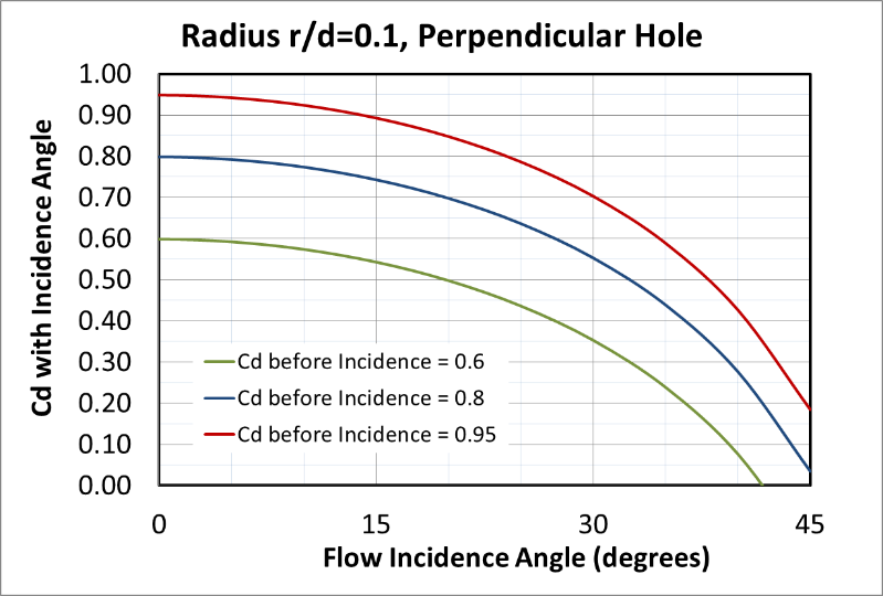 The final Cd is very sensitive to the incidence angle effect. If the upstream flow approaches a hole at a steep angle a large separation region can fill a significant portion of the hole. This will decrease the Cd and flowrate. The incidence angle affects are taken from ref 1. The hole corner treatment and the angle of the hole influence the incidence angle effect.