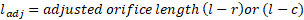 The length of the orifice affects the reattachment of the orifice flow. If the flow can reattach inside the orifice length the losses can be reduced (Cd increased). The program adjusts the length due to a fillet or chamfer so the user should enter the orifice length as if there was no fillet or chamfer. The program does not adjust the length for the hole angle. The user should enter a hole length that includes the angle effect. Equation taken from Huning, ref. 2.