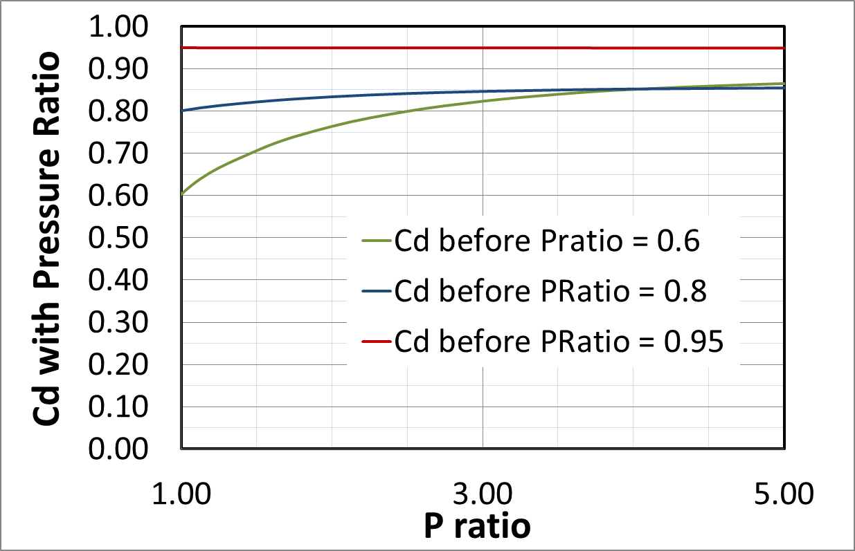 The pressure ratio effect accounts for the compressibility of the gas. It will have no affect for liquid (incompressible) fluids. The maximum pressure ratio used in this equation is 5.0. As the pressure ratio increases the vena contracta increases to cause the higher Cd. Equation taken from Idris, ref. 1.