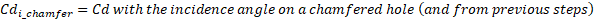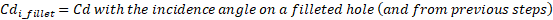 There is no data available for the incidence angle effect on an angled hole with a fillet or chamfer. The sharp corner Cd will be used even if the hole has a fillet or chamfer. The effect is different for holes with positive and negative incidence.