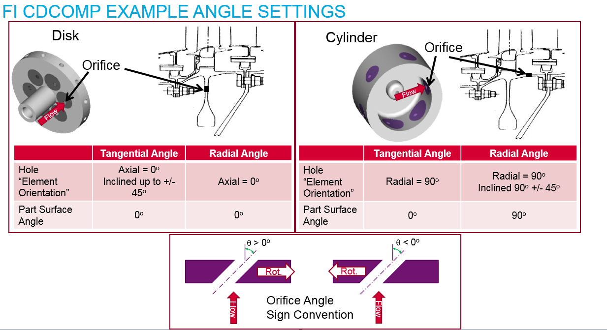 The correct “Part Surface Angle” and “Element Orientation” are critical for an accurate flow incidence angle. One thing to remember is that if the hole centerline is perpendicular to the part surface the “Part Surface Angle” and “Element Orientation” are the same. The “Part Surface Angle” and “Element Orientation” will only be different if the hole is at an angle to the part surface. Examples of “Part Surface Angle” and “Element Orientation” are shown below.