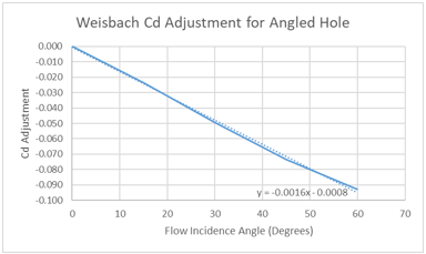 The Weisbach adjustment for an angled hole is valid when the upstream velocity is 0, in other words, a plenum chamber is upstream of the Cdcomp element. It is based on the following equation from Weisbach, but can also be found in Ref 9.