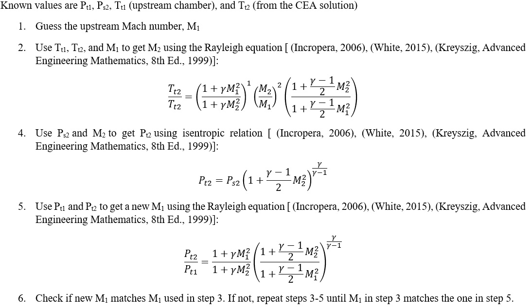 In the combustion element using the Rayleigh Based flow mode, the total pressure loss due to combustion heat addition is modeled by satisfying the Rayleigh equations. Total pressure loss due to heat addition is typically small (less than 1 psi). Flow Simulator combustion elements use an iterative procedure to calculate pre- and post-combustion Mach numbers. The procedure is as follows