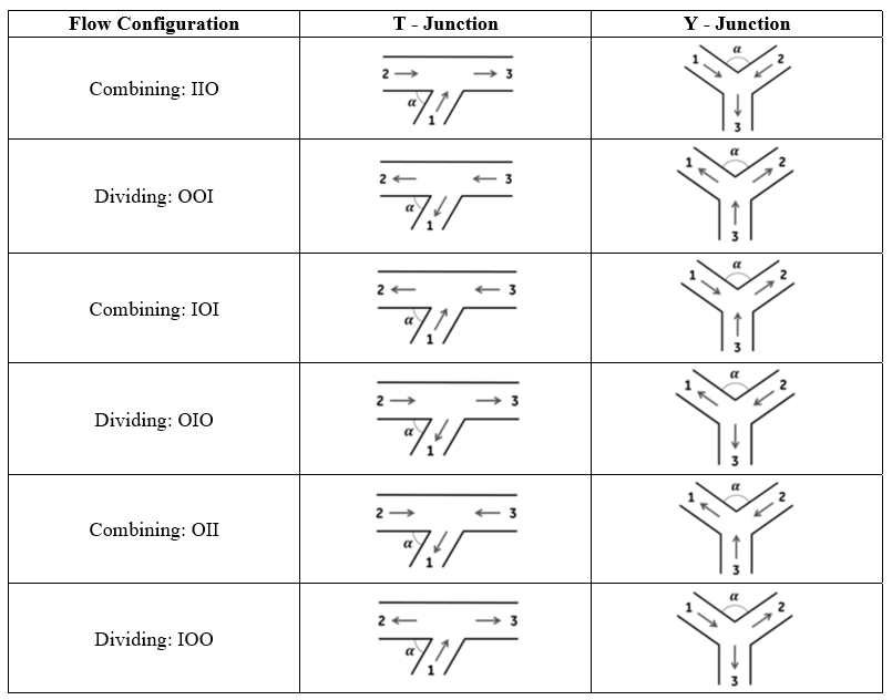 Junction element is a 3-armed element and there are two Flow Simulator junction elements available. Both can be used in compressible and incompressible flow simulations. These elements are used to model different combining and dividing flow configurations, except, all 3 arms cannot have incoming or exiting flow at the same time. The 6 different flow configurations are listed below.