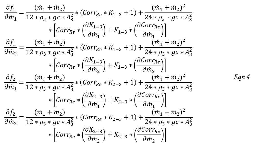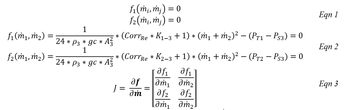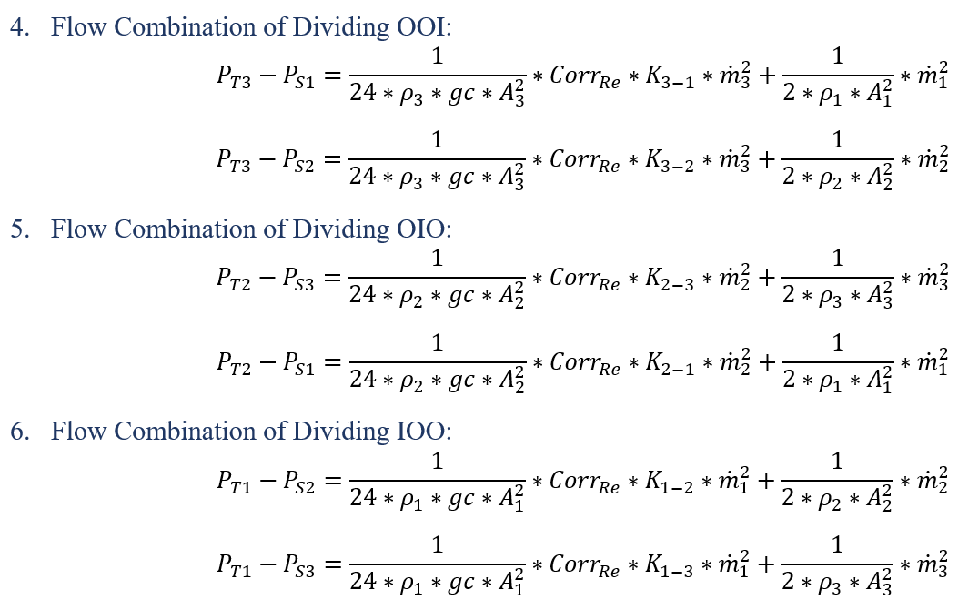 After junction solver is converged to a solution, next step is to calculate another set of derivatives for main solver. If an arm 𝑖 carries incoming flow, then 𝑃 is the total pressure at arm 𝑖. Conversely, if an arm 𝑖 carries exiting flow, then 𝑃 is the static pressure at arm 𝑖. In order to calculate flow derivatives, junction solver constructs a 3x3 matrix from momentum residual equations and continuity equation;