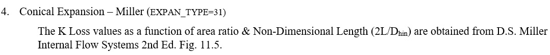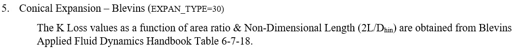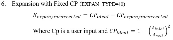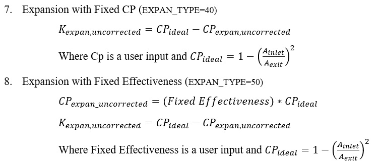Type of expansion. 10:Expansion with Fixed K Loss. 30: Conical Expansion – Blevins 31: Conical Expansion – Miller 40: Expansion with Fixed Cp (Static Pressure Recovery Coefficient) 50: Expansion with Fixed Effectiveness 60: CD Loss |