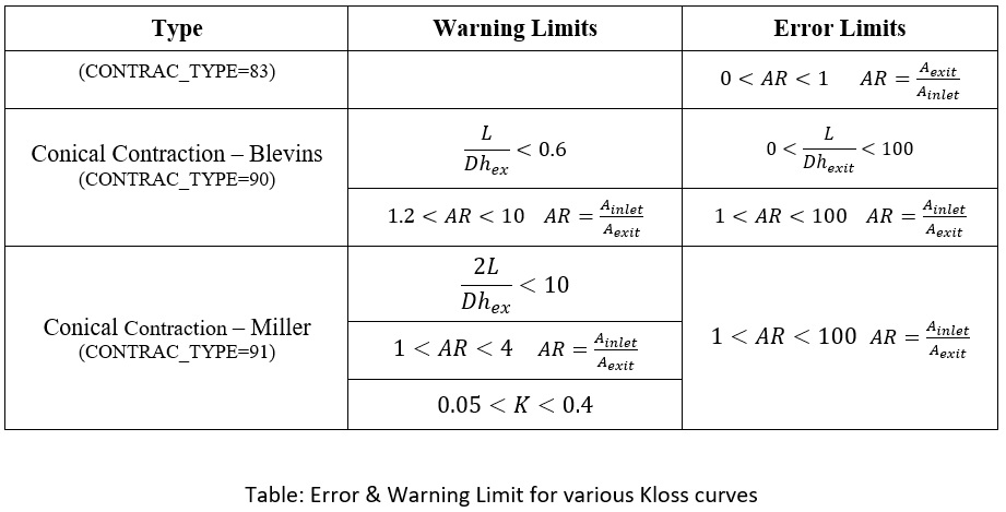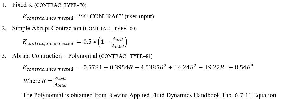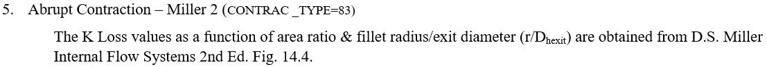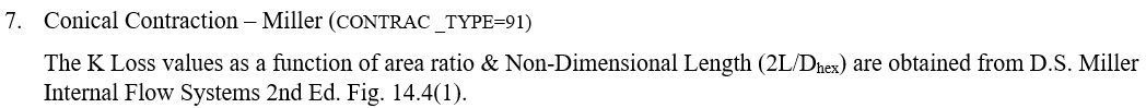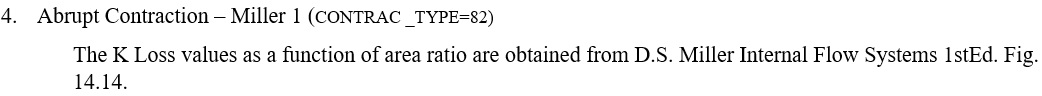 Type of contraction. 70:Contraction with Fixed K Loss. 80: Abrupt Contraction – Simple 81: Abrupt Contraction – Polynomial 82: Abrupt Contraction – Miller1 83: Abrupt Contraction – Miller2 |
