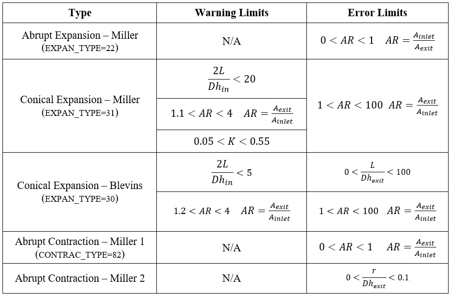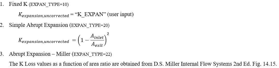 follows. EXPANSION_W_FIXED_K CONICAL_EXPANSION_BLEVINS CONICAL_EXPANSION_MILLER EXPANSION_W_FIXED_CP EXPANSION_W_FIXED_EFFEC ABRUPT_EXPANSION_SIMPLE ABRUPT_EXPANSION_MILLER CD_LOSS CONTRACTION_W_FIXED_K ABRUPT_CONTRACTION_SIMPLE ABRUPT_CONTRACTION_POLYNOM ABRUPT_CONTRACTION_MILLER1 ABRUPT_CONTRACTION_MILLER2 CONICAL_CONTRACTION_BLEVINS CONICAL_CONTRACTION_MILLER |