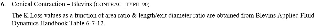 Type of contraction. 70:Contraction with Fixed K Loss. 90: Conical Contraction – Blevins 91: Conical Contraction - Miller |