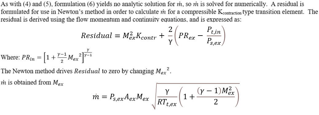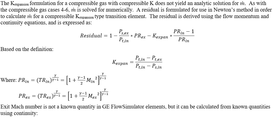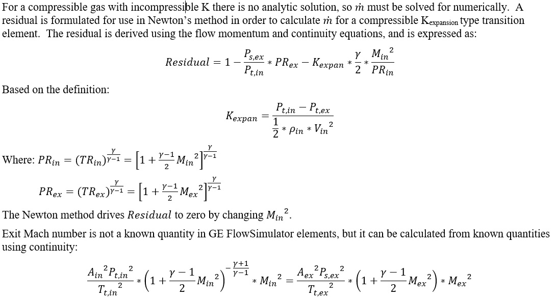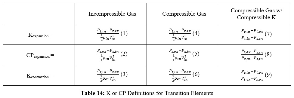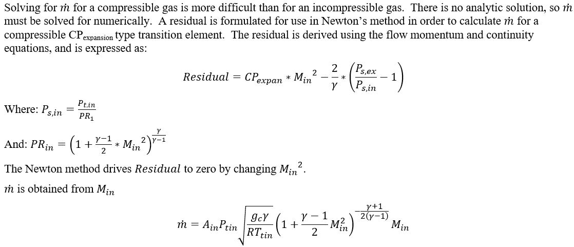 The transition element module applies conservation of mass, momentum, and energy equations to relate static pressure, total pressure, total temperature, and flow rate at the element inlet with those at the element exit. All contractions are governed by contraction Kloss for their momentum equation. Expansion elements are divided into two categories: Those that use expansion K and those that use diffuser CP for the momentum equation. All transitions break down into these three different momentum equation types. In addition, transitions use one of three different gas assumptions: