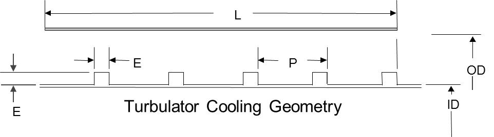 There Turbulator element models the frictional pressure drop across the Turbulated passage. This element can be found under both “Compressible Gas Elements” & “Incompressible Liquid Elements”. The geometric inputs like inner diameter (ID), outer diameter (OD), passage length(L), Rib Pitch (P), Rib height (E) are mandatory inputs. Apart from these, inputs related to friction are required if friction options are selected. Descriptions about each input is described below in “Turbulator Element Inputs” section.