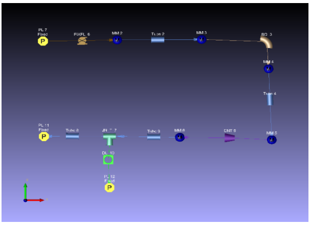 Flow Simulator networks consist of flow conduits known as “elements” connected between nodes known as “chambers.” The boundaries of the network are defined by "boundary chambers," which have fixed fluid properties, both thermodynamic and dynamic. Flow passes into and out of the network via boundary chambers. Various types of elements are available for use within a flow network. The selection of elements consists of orifices, tubes, valves, junctions, bends, transitions and seals, vortexes, and variations thereof. All element types have one upstream chamber and one downstream chamber.