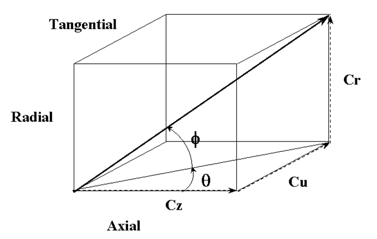 Flow Simulator uses a three-dimensional coordinate system. The coordinate system is orthogonal and, in the case of inertial chambers, represents a cylindrical system about the axis of rotation. The following figure defines this coordinate system.