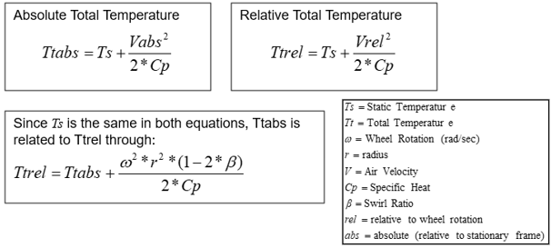 If the convector is attached to a fluid chamber, the convector uses a relative total temperature from the fluid chamber. The relative total temperature applies to models with rotating surfaces, as found in a gas turbine secondary air systems. The swirl of the fluid in the chamber and the rotational speed of the surface (set on the thermal node) are used to calculate the relative total temperature.