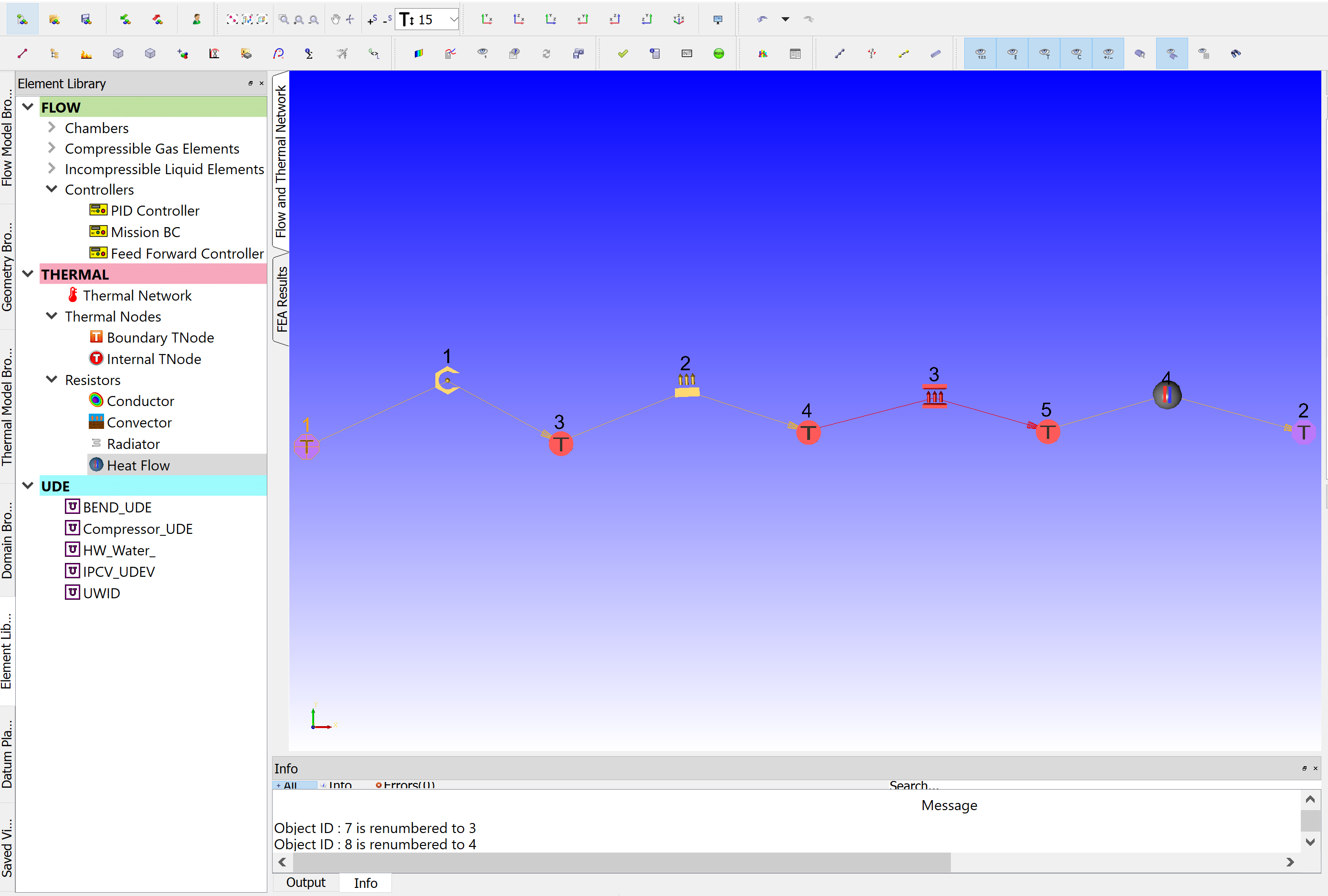 Use Flow Simulator to couple one (or more) thermal network with a flow network, or model standalone thermal networks. The Thermal Network section is placed after the Flow section in the Element Library. Moreover, all thermal network elements used in the models are listed in Thermal Model Browser.