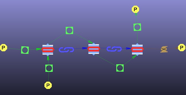 - Connect incompressible link element between the first (HX1) and second heat exchanger (HX2), between the second (HX2) and third heat exchanger (HX3) to transfer data between heat exchanger elements without any additional pressure or heat loss