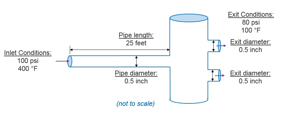 Flow network simulates air flowing through a long pipe with a 1/2“ inner diameter into a large tank. The air then exits the tank through 2 exits.