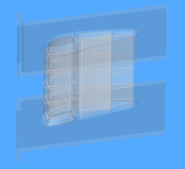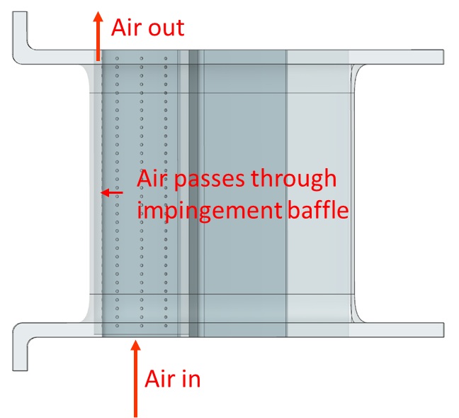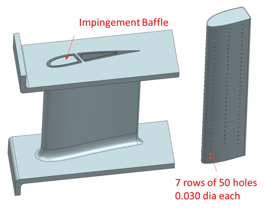 - Cooling air comes in through the bottom of the leading edge cavity and pressurizes the inside of the baffle, pushing the air through the impingement holes, and then exits through the gap between the baffle and the inside wall of the leading edge cavity at the top of the nozzle (shown in Figure 1.02)
