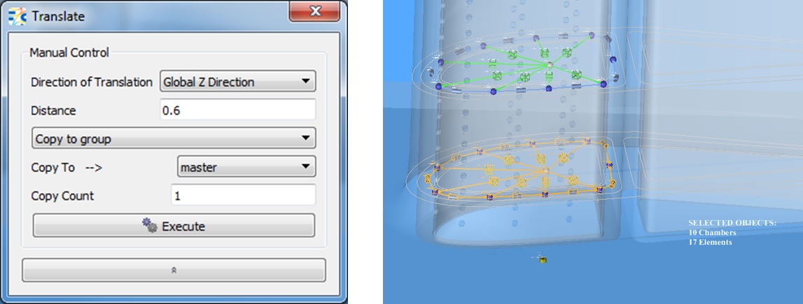 - Select all chambers and elements in the first layer and Right Click → Translate