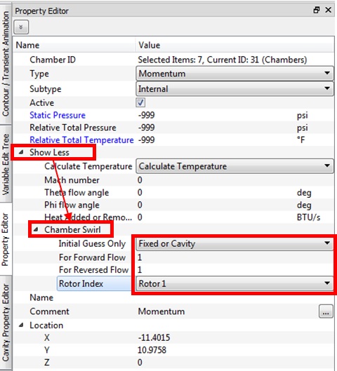 - Due to the rotating nature of the blade, the user will have to account for the pressure and temperature rise from the pumping created by the rotation, by enabling Chamber Swirl and specifying a Rotor Index for the elements.