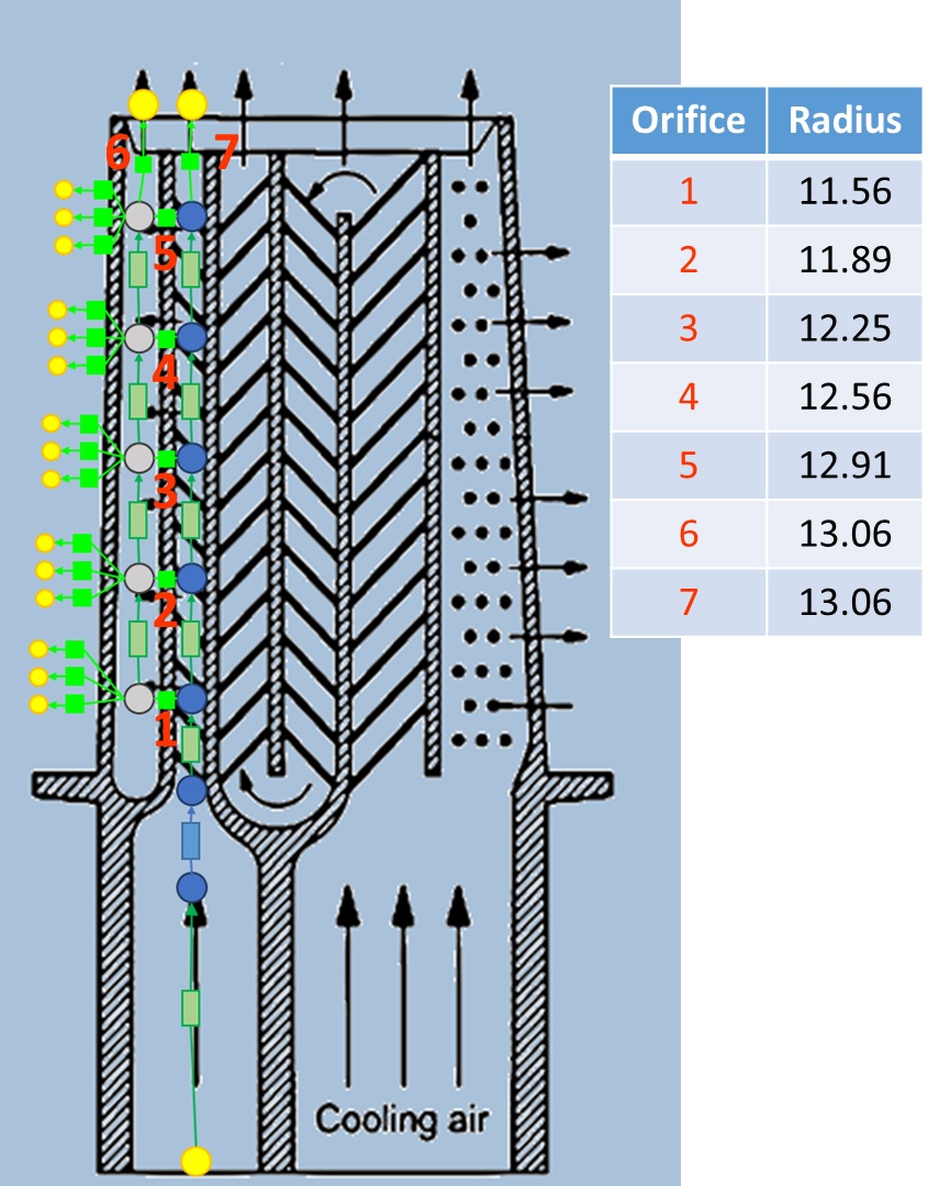 - Set Diameter to 0.02 in and Cd to 0.8 for all film hole Conventional Orifice elements