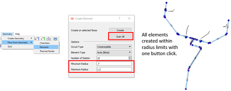 - The user interface process for automatic element creation is more robust and faster. The Scan All option creates elements on all cylindrical surfaces in the model that fall within a user-supplied radius range.