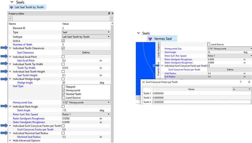- You can input several inputs of the Tooth-by-Tooth labyrinth seal for each tooth. The inputs include tooth geometry such as Pitch, Width, Height, Angle, and Radius from the engine centerline. The Tooth-by-Tooth and Vermes seal have a swirl carryover that can be entered for each tooth. The loss methods for the first tooth of the Tooth-by-Tooth seal have been changed to ignore kinetic energy carryover and stepped effects. This change improves the match to validation data.