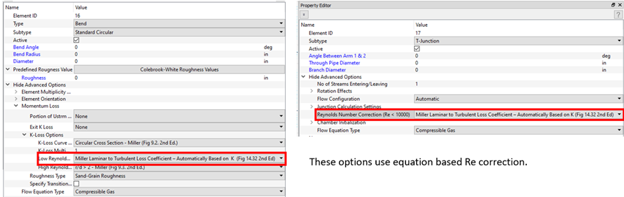 - Several elements (orifice plate, transition, valve) use a Reynolds number correction for loss factor (k). Many empirical k’s are based on a turbulent Re. If an element has a laminar Re, the turbulent k is corrected. The correction factor can come from tables or an equation. The existing tables were modified to improve performance of the linear interpolation. The equation option was added to the junction and bend.