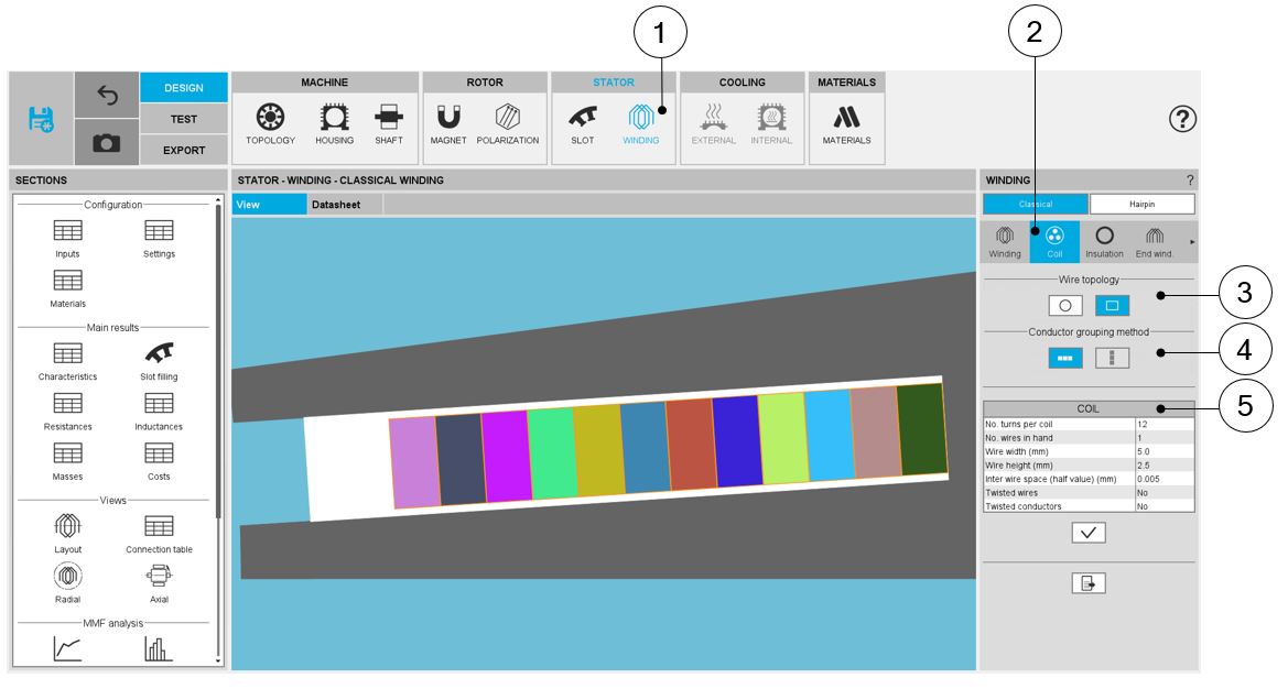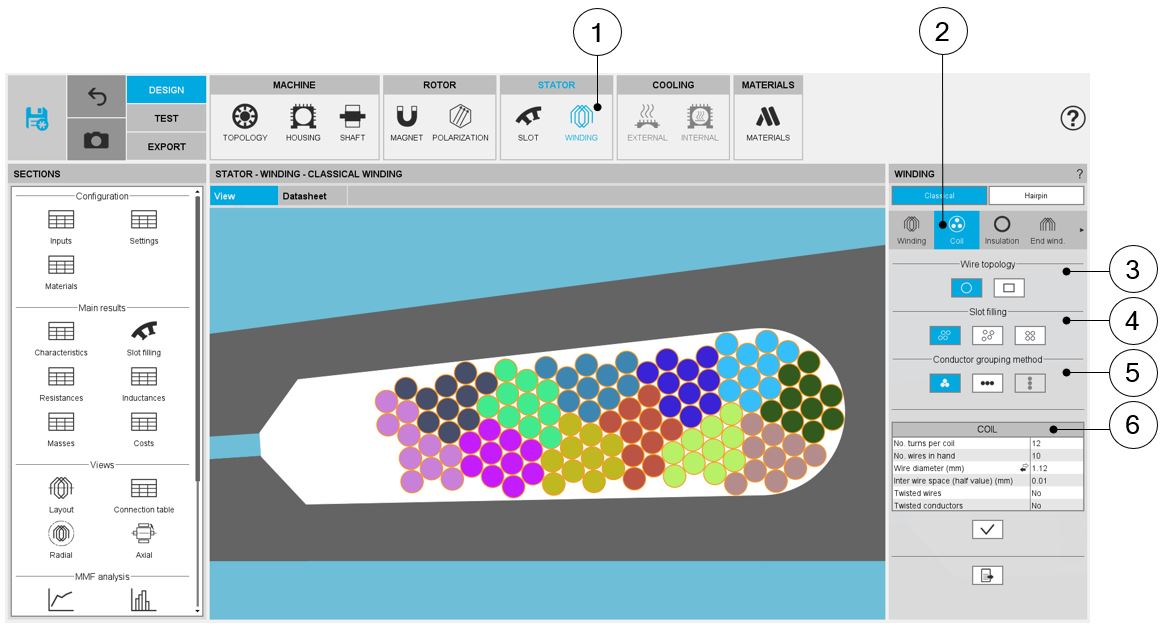 | 2 | Coil settings allows the user to describe the coil composition (turns, wires, dimensions) and how to fill the slot. |