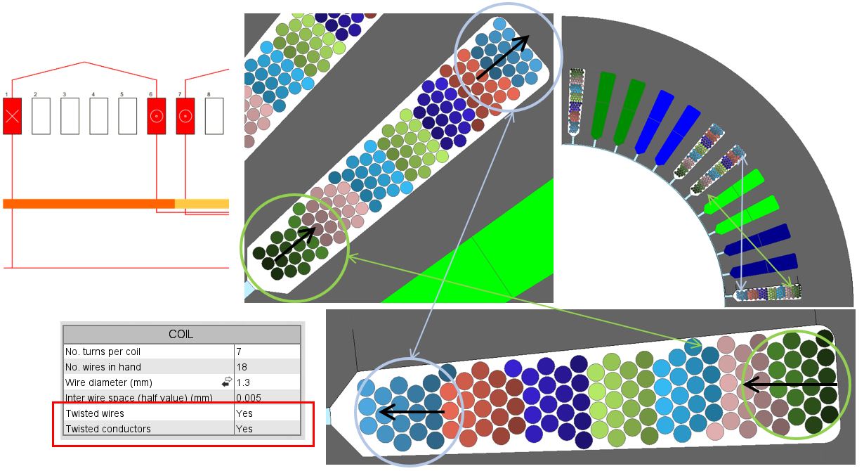 While defining the coil in the design / Winding area, it is possible to twist the wires inside the conductors between the forward and return sections of the coil. It is also possible to twist the conductors between the forward and return sections of the coil.