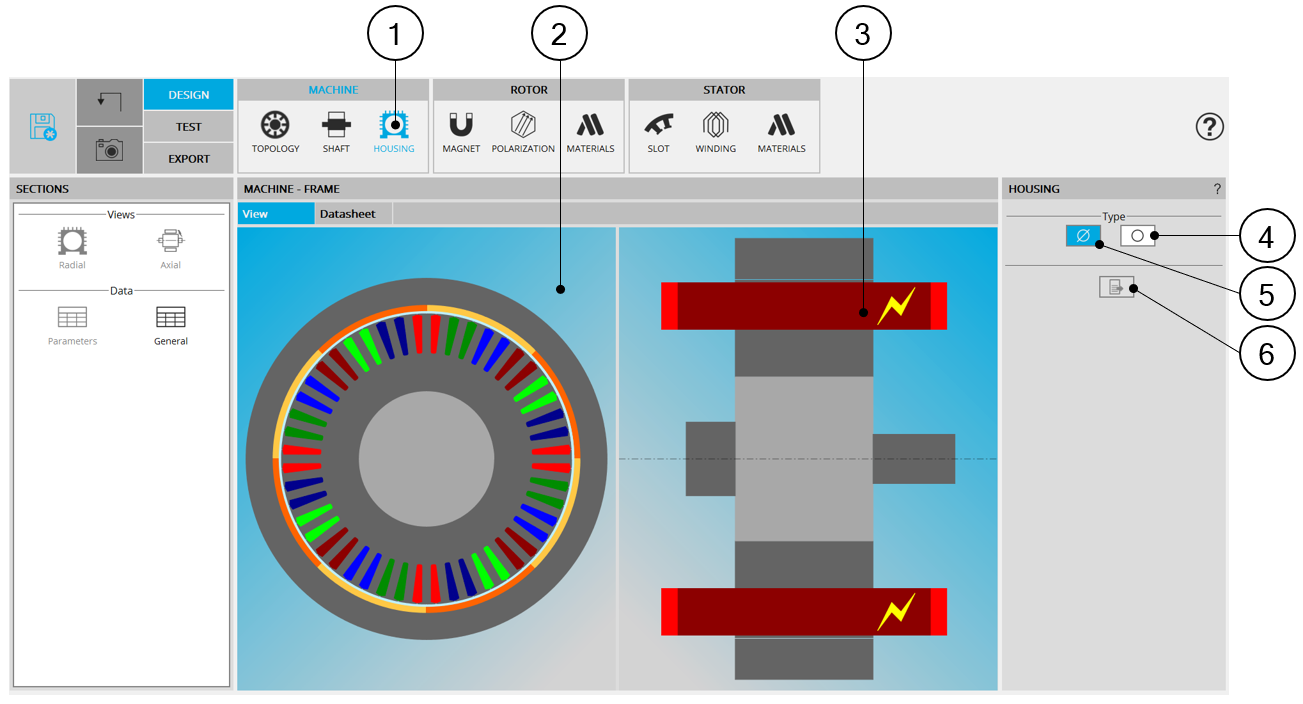 | 1 | Selection of the MACHINE subset: HOUSING panel (Click on the icon HOUSING) |