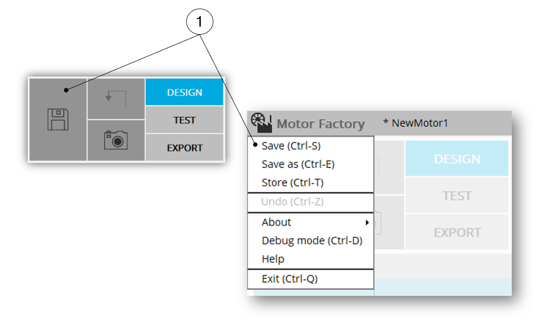 | 1 | Access to the top menu of Motor Factory to access the “SAVE AS” function. |
