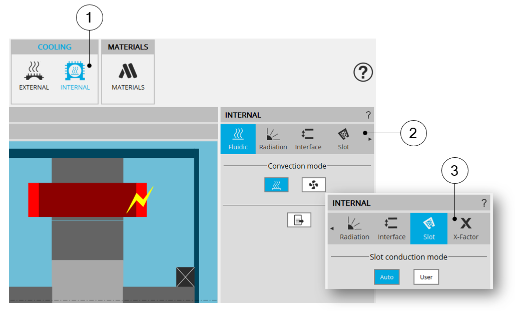 | 2 | Scrolling selection bar where Fluidic, Radiation, Interface, Slot sections can be selected. |