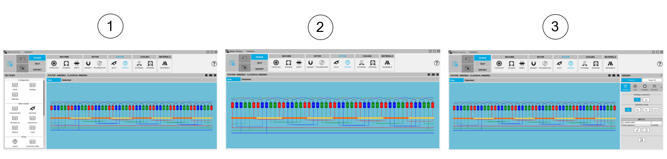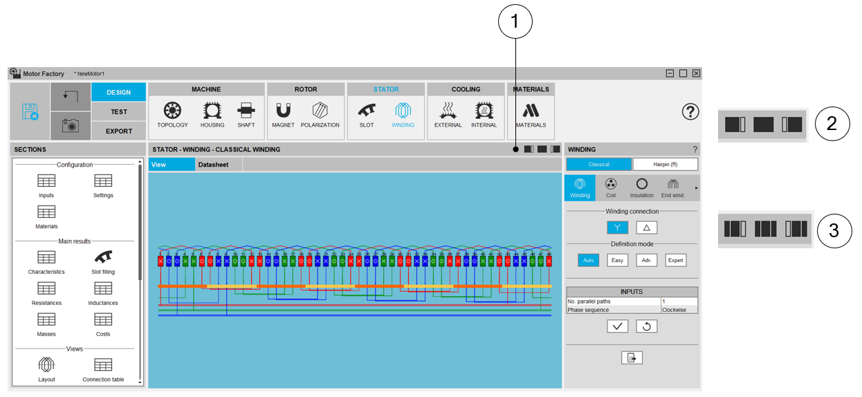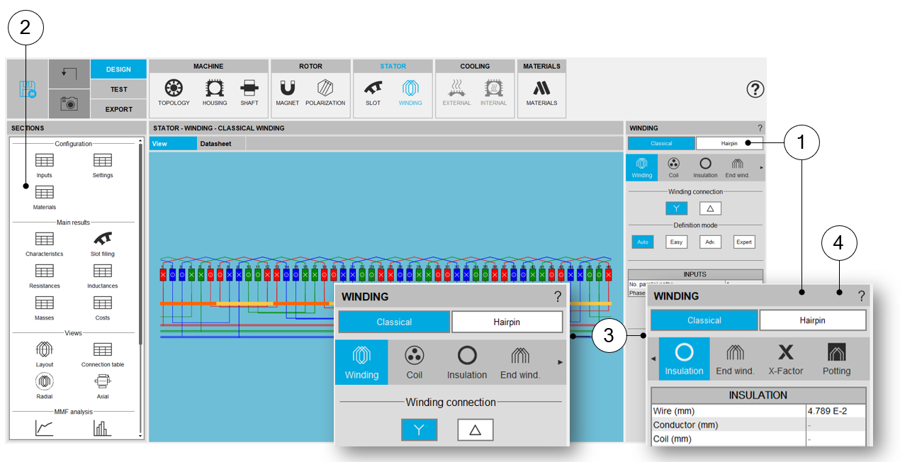 | 1 | Scrolling selection bar where Winding, Coil, End-winding, X-Factor and Potting sections can be selected. |