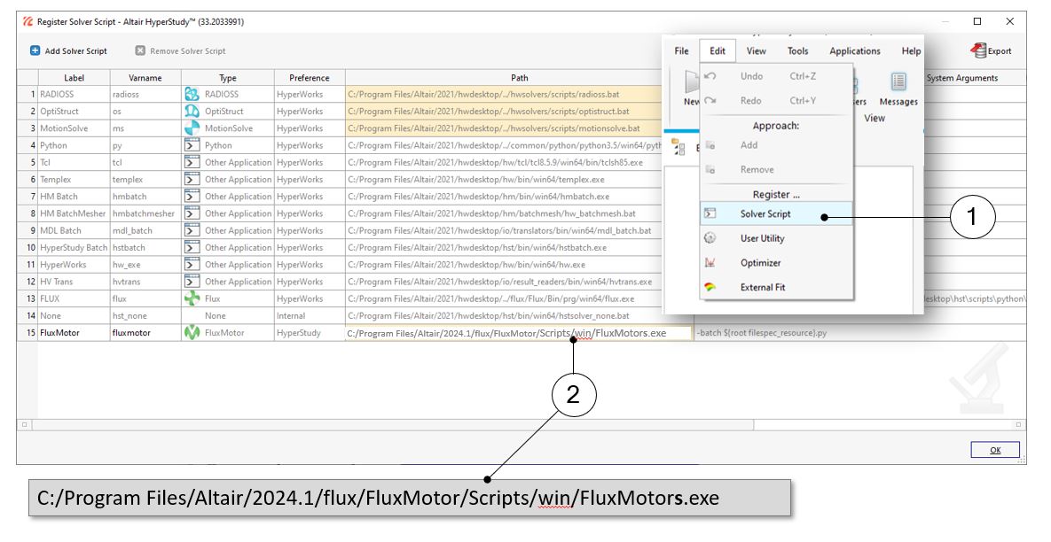 Before starting new studies in HyperStudy® by using connectors exported from FluxMotor® , FluxMotor® must be registered as a new solver script in HyperStudy®.