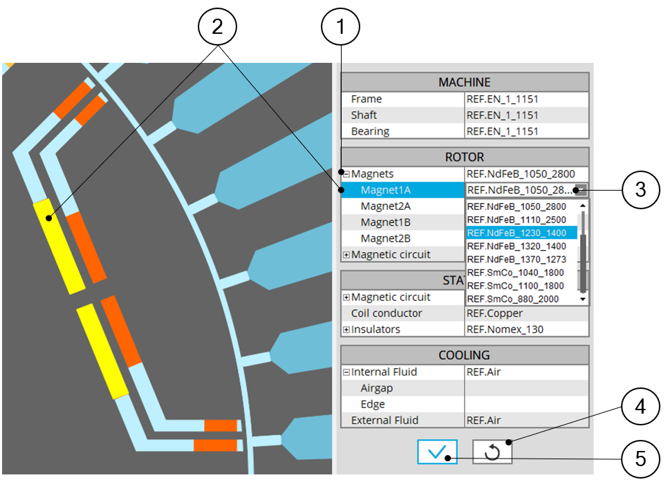 | 3 | Expand the material list to choose a magnet material for assigning to the selected magnet. |