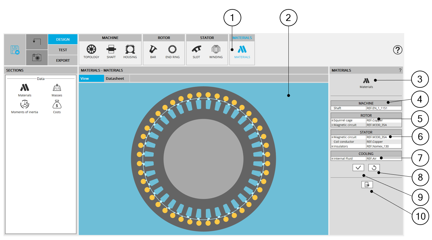 | 1 | Selection of the Material subset: MATERIALS panel (Click on the icon MATERIALS) |
