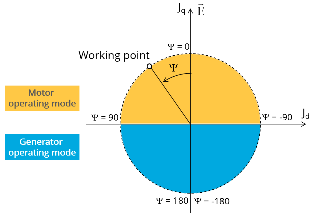 Considering the vector diagram shown below, the “ Control angle ” is the angle between the electromotive force E and the electrical current (J) (Ψ = (E, J)).