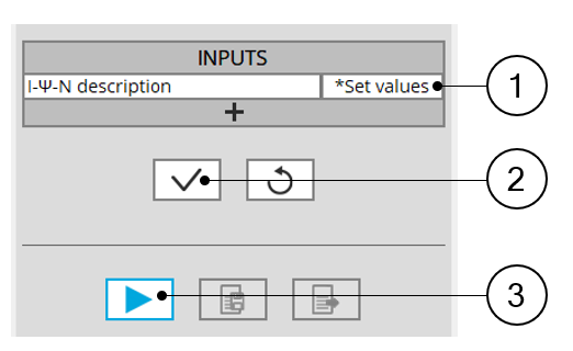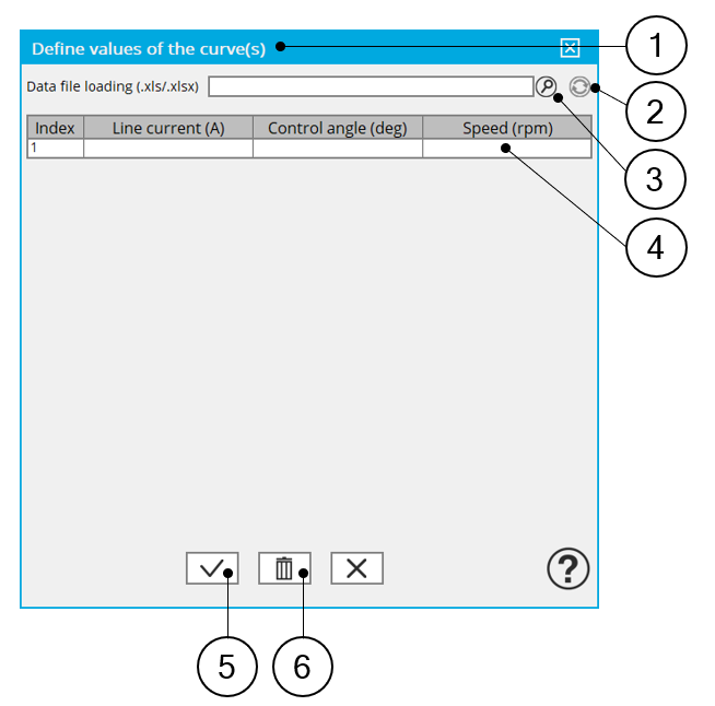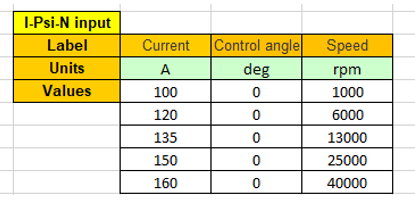 | 1 | Click on the button “Set values” of the field “ I, Ψ, N description” to define the working points in a dialog box. Refer to the next illustration which shows how to fill the working point table. |