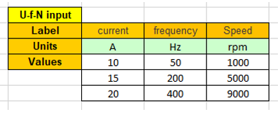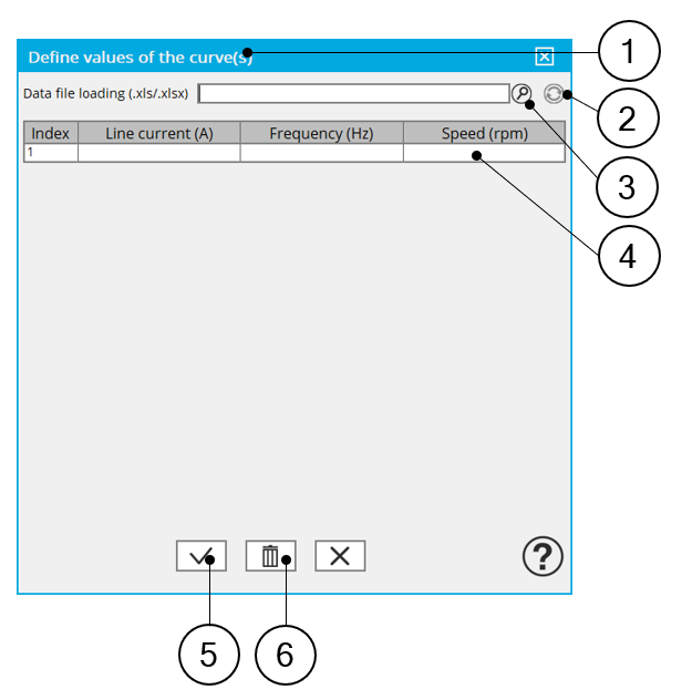 | 1 | Click on the button “Set values” of the field “ I, f, N description” to define the working points in a dialog box. Refer to the next illustration which shows how to fill the working point table. |