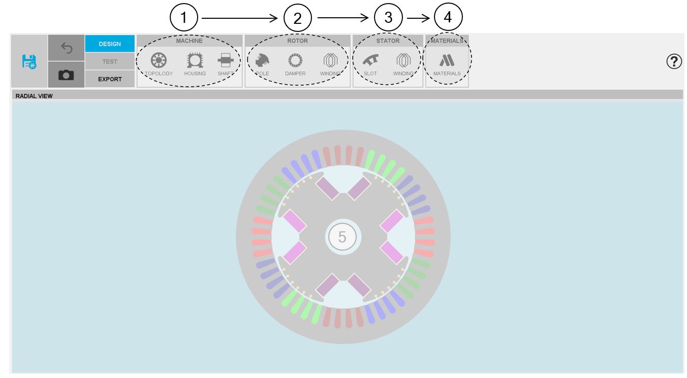 | Zone 4 MATERIALS | Area to select all the materials required to build the machine, the rotor, and the stator |