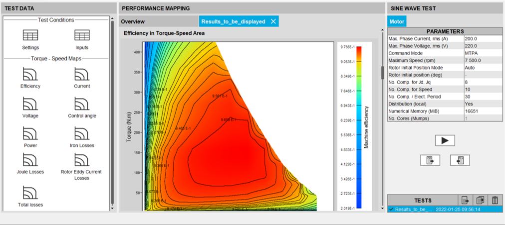 The aim of the test “Performance mapping – Sine wave – Motor – Efficiency map - FeMT” is