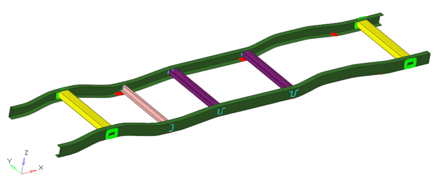 The model being used for this exercise is that of an automotive frame. The fem file consists of the 3 static load steps to which the frame is subjected to – Frontal torsion, Rear torsion and the Vertical Bending.