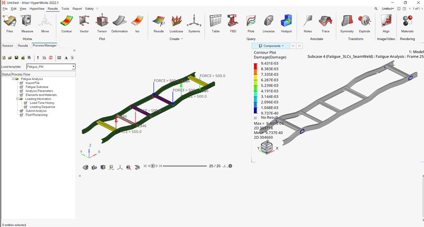 This launches HyperView and loads the seamweld_frame_fat.h3d results file. It applies the result contour for selected result type and component. You can use HyperView for more detailed results.