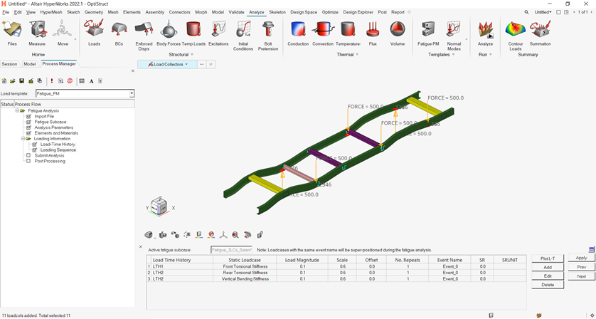 - Drag and drop the three subcases (Front Torsional Stiffness, Rear Torsional Stiffness and Vertical Bending Stiffness) under Subcases of the newly created event.