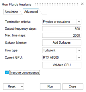 提高收敛 使用高级设置下的提高收敛选项可能有利于具有长流体路径或精细体素网格的设计。 为 Fluids 分析准备模型。 点击“分析”工具组中的自定义 Fluids 运行卫星图标。 提示: 要查找并打开工具,按 Ctrl+F。更多信息请见查找和搜索工具。 此时会弹出“运行 Fluids 分析”窗口。 点击高级选项卡。 启用提高收敛。 鼠标右击划过勾选标记以退出,或双击鼠标右键。 重新运行仿真。
