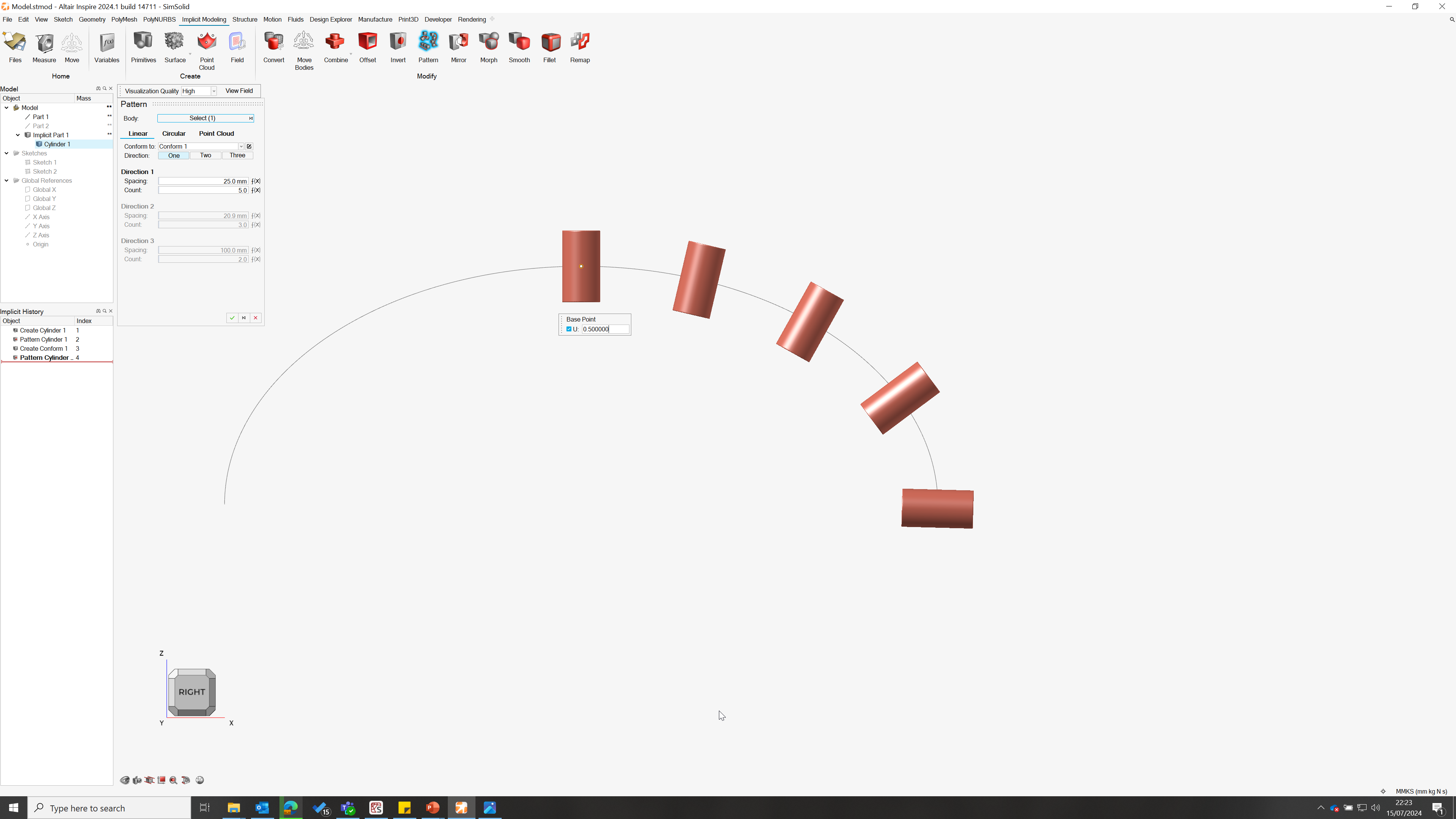 隐式主体可以沿一条曲线进行图案化。所选隐式主体的实例将遵循曲线,并且可以根据参数坐标或长度单位的距离均匀分布。